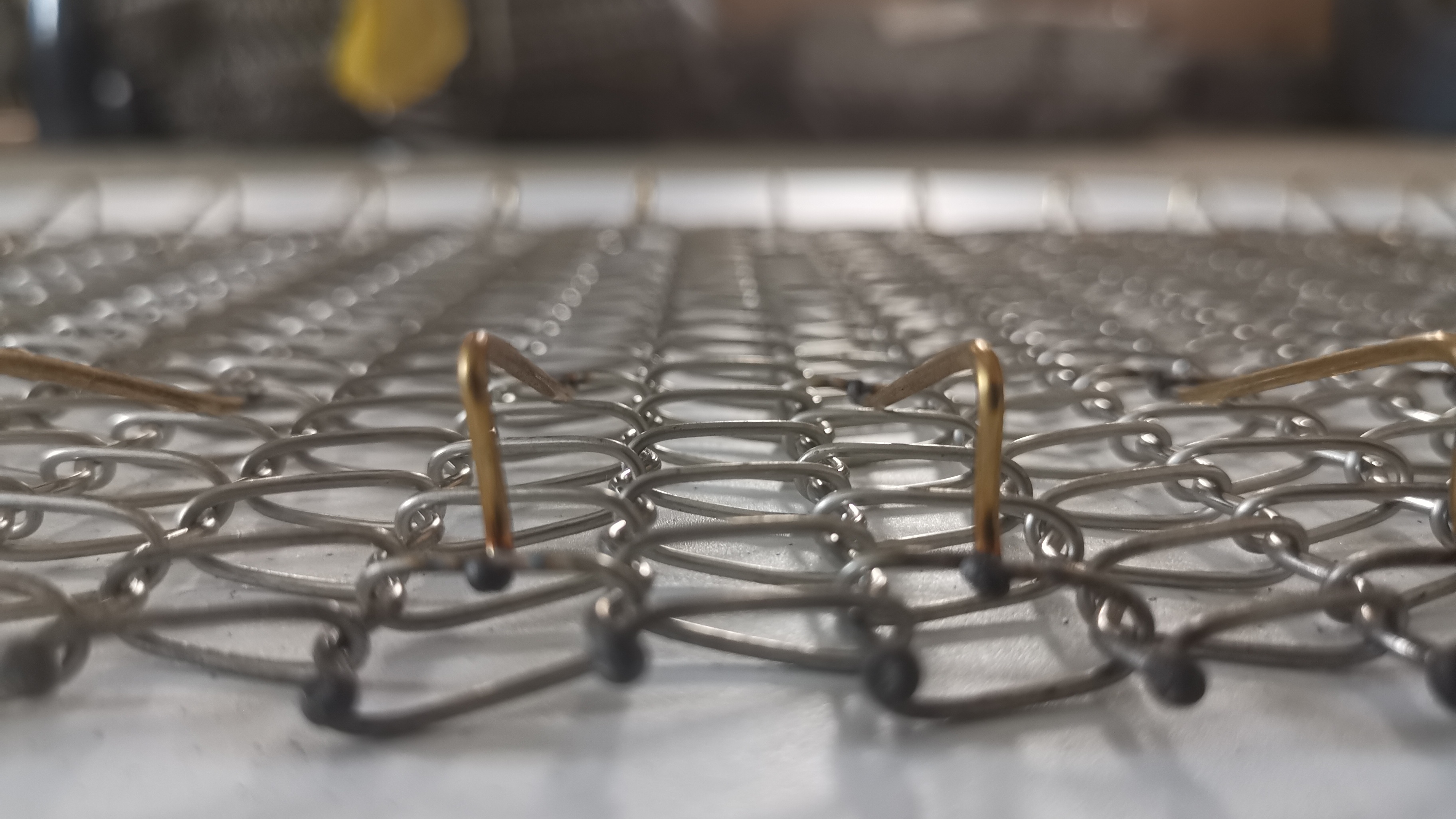 太陽能電池片網(wǎng)帶主要使用耐高溫和抗腐蝕的軟性金屬網(wǎng)材料制成,并通過全自動化的繞絲和穿絲設(shè)備生產(chǎn)出精確規(guī)格的繞絲和穿絲。網(wǎng)帶經(jīng)過穿絲過程后,完成成型。半成品清洗后,通過邊緣與頂針的焊接,完成整個(gè)網(wǎng)帶的生產(chǎn)。頂針通常會進(jìn)行鍍鈦處理,鍍金鈦的頂針的網(wǎng)帶多用于絲網(wǎng)印刷烘干爐,鍍黑鈦頂針的網(wǎng)帶多用于電池片燒結(jié)爐。該網(wǎng)帶使用直徑1.0mm-直徑1.6mm的較細(xì)網(wǎng)絲,可以降低爐膛熱量損耗,增加電池片的受熱面積。